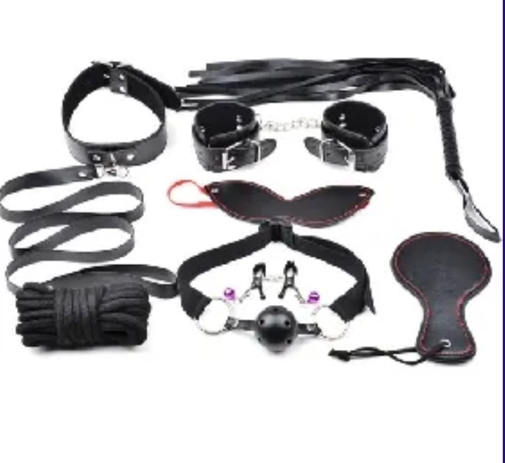 Tie em up, spank em, let just be in control….. Ball gag Handcuffs Collar with lead Rope Blindfold Nipple clamps Paddle Whip